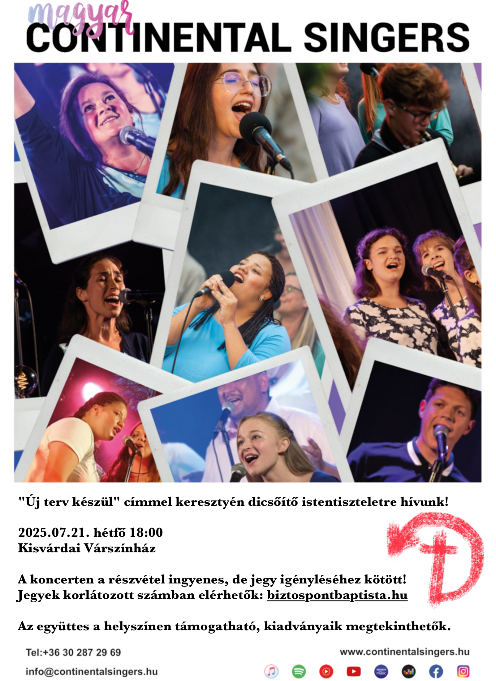 Szeretettel hívunk, várunk mindenkit a MAGYAR CONTINENTAL SINGERS koncertjére. A 25 főből álló együttes idén is elszántan indult útnak, hogy a zene nyelvén hirdesse az evangéliumot.